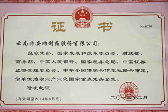 近日,特安呐公司喜报频传,除获得“云南省成长型中小企业”、“云南省科技型中小企业”等荣誉称号外,又获得国家农业部等八部委联合颁发的“农业产业化国家重点龙头企业”称号,这是特安呐公司第3次荣获此殊荣。