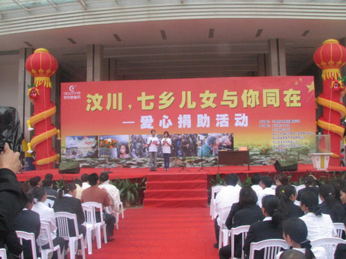 活动上,云南特安呐制药集团公司全体员工、文山州歌舞团、文山电视台记者、工作人员纷纷上台,把七乡儿女对灾区群众深深的祈福、同为中华儿女的深情厚义一一展现。特别是沈建、刘艳两位主持人和唐霞小朋友深情的诗朗诵《孩子,快,拉住妈妈的手》,
