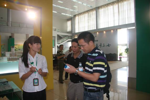 公司李光云副总、熊文福副总在公司展示厅热情接待吕博士一行,并由我公司工作人员向来宾介绍公司的基本情况及主要产品,使来宾更深层次地了解公司概况。在公司众多产品中,来宾对公司所生产的血塞通片、七生力片、七生静片印象颇为深刻,通过对展示厅的参观,更深一步的认识文山三七、了解文山三七的作用和功效。