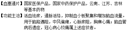 【功能主治】活血祛瘀,通脉活络,抑制血小板聚集和增加脑血流量。用于脑路遇阻,中风偏瘫,心脉瘀阻,胸痹心痛;脑血管病后遗症,冠心病心绞痛属上述症状者。