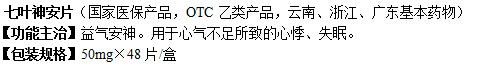 七叶神安片(国家医保产品,OTC乙类产品,云南、浙江、广东基本药物) 【功能主治】益气安神。用于心气不足所致的心悸、失眠。 【包装规格】50mg×48片/盒