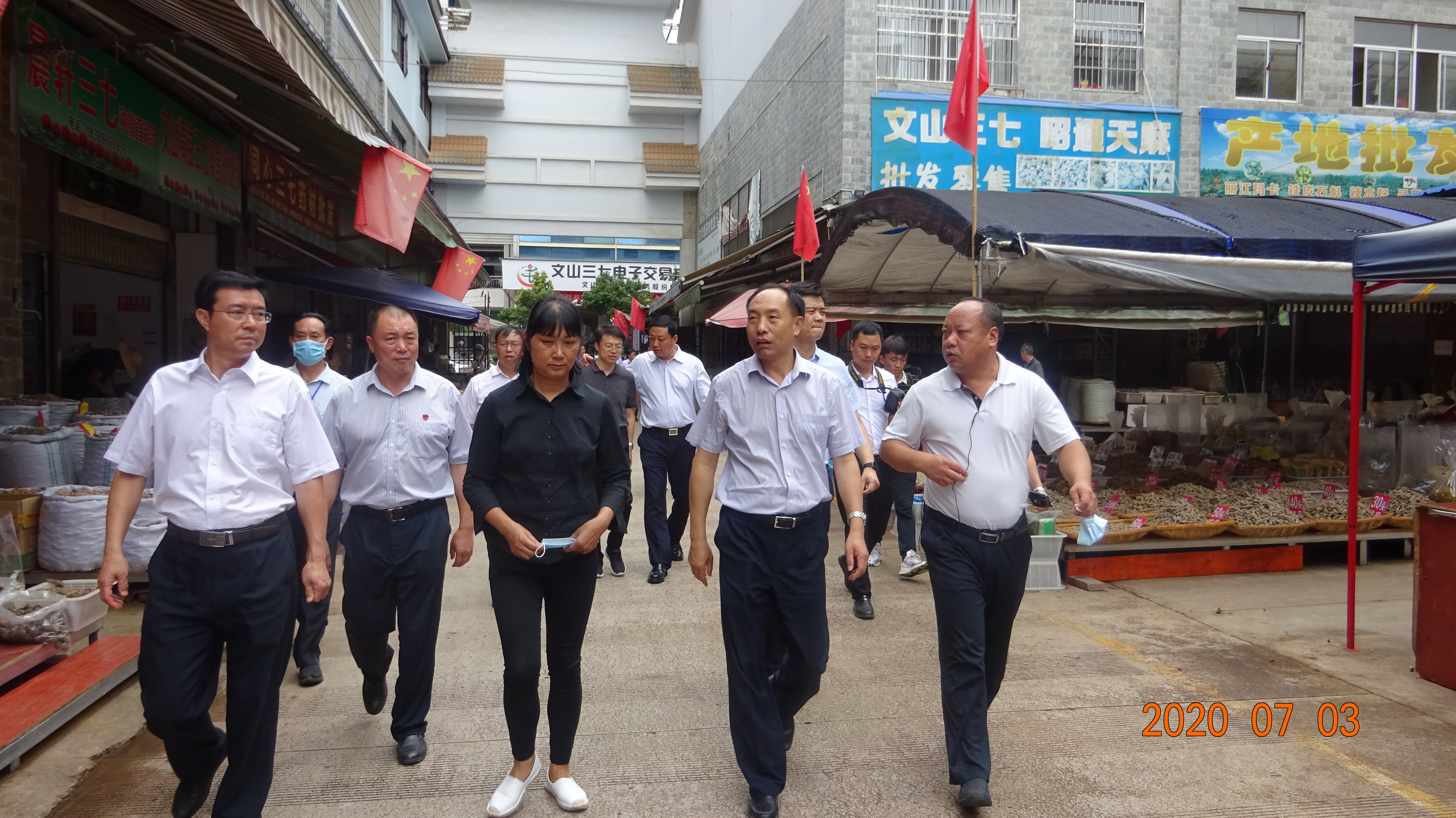 2020年7月3日,云南省人大常委会副主任李培率调研组到文山三七国际交易中心调研,州人大常委会主任徐昌碧陪同。特安呐公司总经理助理宣光玉率相关人员在文山三七国际交易中心迎接。李培一行来到文山三七国际交易中心精品区,看到两侧商户林立,大大小小的三七堆放整齐,地面卫生整洁干净,车辆停放有序。李培听取工作人员情况介绍后,对文山三七国际交易中心运营管理给予了充分肯定和高度评价。