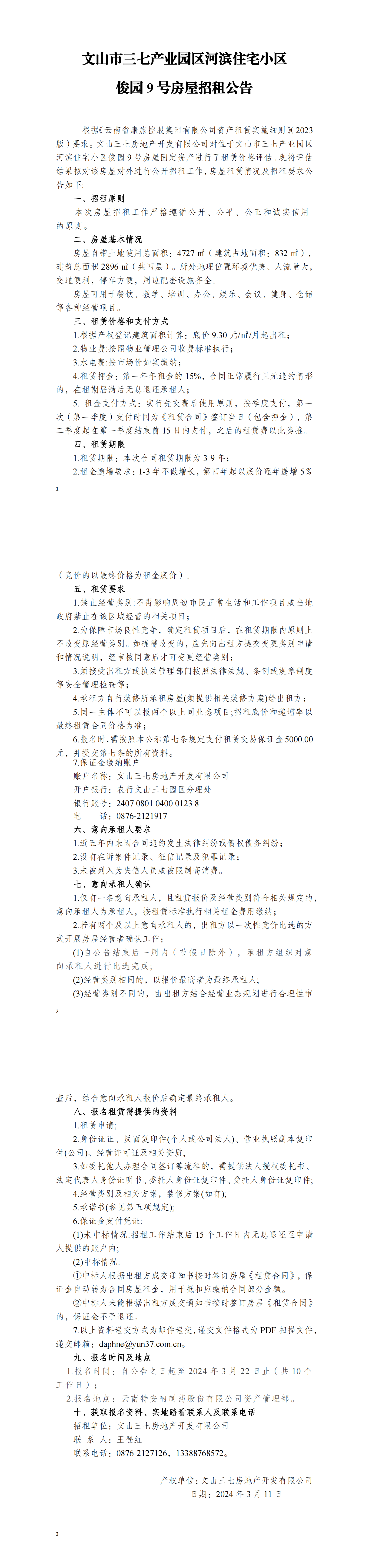 文山市三七产业园区河滨住宅小区——俊园9号房屋招租公告