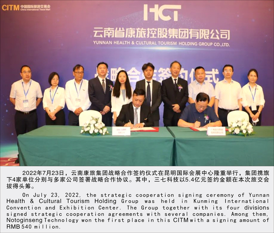 2022年7月23日,云南康旅集团战略合作签约仪式在昆明国际会展中心隆重举行,集团携旗下4家单位分别与多家公司签署战略合作协议。其中,三七科技以5.4亿元签约金额在本次旅交会拔得头筹。
