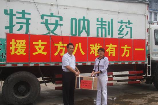 北京时间2014年8月3日16时30分许,云南省昭通市鲁甸县境内发生6.5级地震。地震造成昭通市鲁甸县、巧家县、昭阳区、永善县和曲靖市会泽县108.84万人受灾。其中,615人死亡,3143人受伤,22.97万人紧急转移安置,2.58万户8.09万间房屋倒塌。灾情发生后,董事长唐修文第一时间指示常务副总田庆联系文山州红十字会,表达公司将向灾区捐赠药品救治伤员。8月8日下午,公司在厂区内举行了简短的捐赠仪式,常务副总田庆代表特安呐向地震灾区捐赠一批价值100万元药品,文山州红十字会领导出席了捐赠仪式。9日,公司派车将药品送至普者黑机场,满载着特安呐全体员工深情厚谊的药品将空运至鲁甸地震灾区。