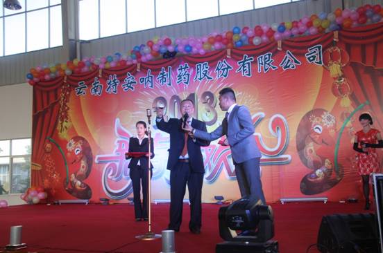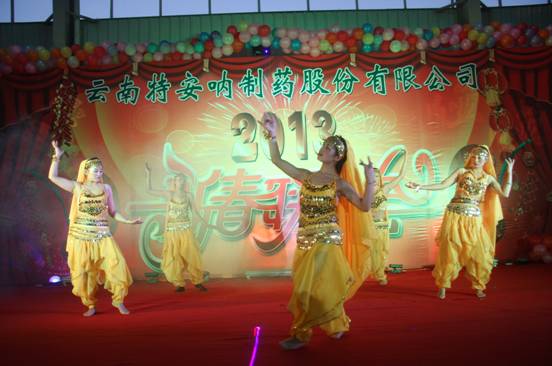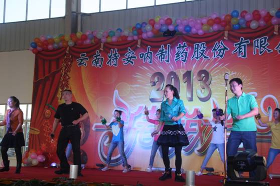 2013年2月5日,特安呐公司一年一度的春节晚会又拉开帷幕,来自各分公司、各条战线的四百多名员工聚集在公司总部,共庆2013年新春佳节。18时,由项目部和技术部共同表演的《最弦特安呐》拉开晚会的序幕,员工演员们又说又唱,表达了在特安呐工作最光荣的理念,观众对他们精彩的表演给予最热烈的掌声。提取车间张嘉华的一曲《向往神鹰》,将大家的思绪带到青藏高原,寓意特安呐人也如神鹰一样翱翔在祖国的蓝天,把三七制药做强做大,为人类带去健康福音。质量部表演的舞蹈《江南style》,让我们感受到“鸟叔”又来到了特安呐,带领大家共跳骑马舞。大家边演边吃,边吃边看,台上台下连成一片,欢乐的笑声其乐融融。直到员工自编自演的十四个节目表演完,大家仍意犹未尽,纷纷跑到台上唱起《难忘今宵》。难忘今宵,让我们记住今天,大家相聚在一起,把特安呐变成欢乐的海洋,明天我们又将奔向各自的岗位,去谱写新一年辉煌的篇章。