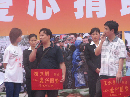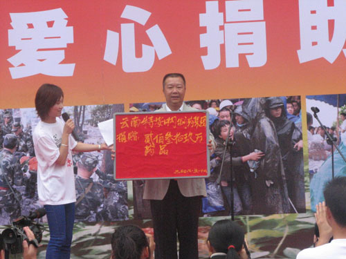 地震无情人有情、一方有难八方帮。在活动现场,云南特安呐制药集团公司总裁唐修文率先为汶川灾区捐赠价值239万元的三七类药品,并号召公司员工积极参与,为灾区人民奉献爱心。文山宝业房地产开发有限公司捐赠价值103.4万元三七类药品。
