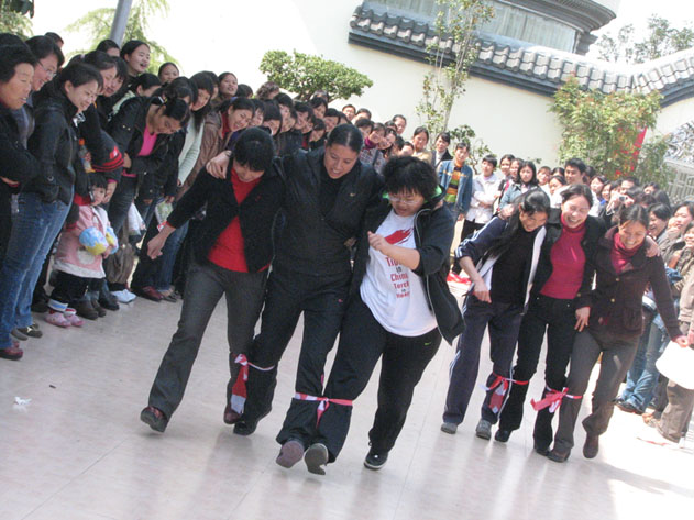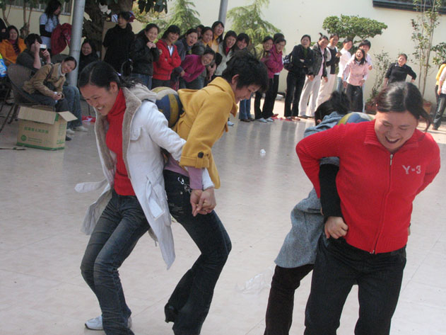 第三项是挟乒乓球接力比赛,队员们要拿着筷子跑到放置乒乓球的碗前,将乒乓球从一个碗挟到另一个碗。由于地面是瓷砖,有点滑,女队员都不敢放开全力跑。挟乒乓球更是不敢怠慢,乒乓球就像泥鳅一样,在碗里跑来跑去,女队员都拿出平时刺绣的功夫和耐心,一个一个挟住,观众们都为他们捏了一把汗………