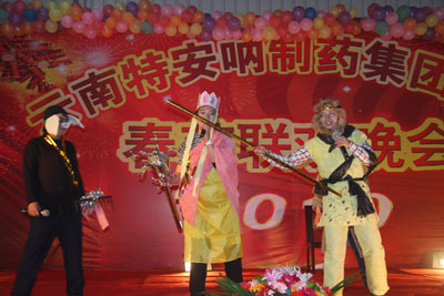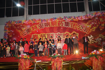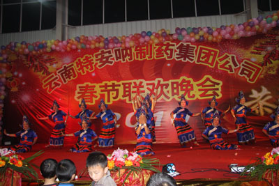 欢欢喜喜过大年,热热闹闹迎新春。2010年2月8日晚,云南特安呐制药集团公司内外张灯结彩,装饰一新,厂区上空回荡着欢快、热烈的新年音乐歌曲,处处洋溢着迎春贺岁的节日气氛。文山州、县领导及友好兄弟单位和特安呐公司全体员工共六百余人欢聚一堂,共贺2010年新春的到来,共享一年来收获的喜悦。