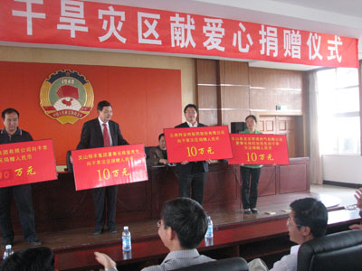 2010年3月2日,文山州政协组织各民主党派、工商联和非公经济界向干旱灾区献爱心捐助活动,捐赠会上,各界积极响应,踊跃捐款。我公司为弘扬“一方有难、八方支援”的团结协助精神,此次捐赠会上共捐款10万元,为受灾群众提供援助,帮助灾区人民度过难关,体现了公司“大灾面前有大爱”的社会责任心。