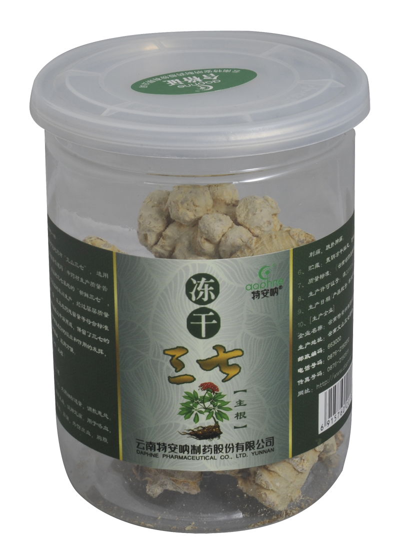 【产品描述】:本品原料来源于地道药材“文山三七”,选用通过国家食品药品监督管理局《GAP》认证的三七基地的优质三七,通过中药饮片《GMP》认证的车间生产,经过层层质量把关,重金属砷、铅、汞及农药残留量等符合标准规定。本品采用低温真空干燥而成,保留了三七的活性成分,有利于活性成分的浸出和作用的发挥,且组织疏松,易于磨碎,服用方便。