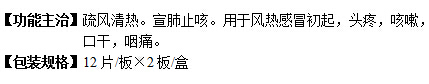 用于风热感冒初起,头疼,咳嗽,口干,咽痛。