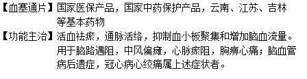 【功能主治】活血祛瘀,通脉活络,抑制血小板聚集和增加脑血流量。用于脑路遇阻,中风偏瘫,心脉瘀阻,胸痹心痛;脑血管病后遗症,冠心病心绞痛属上述症状者。