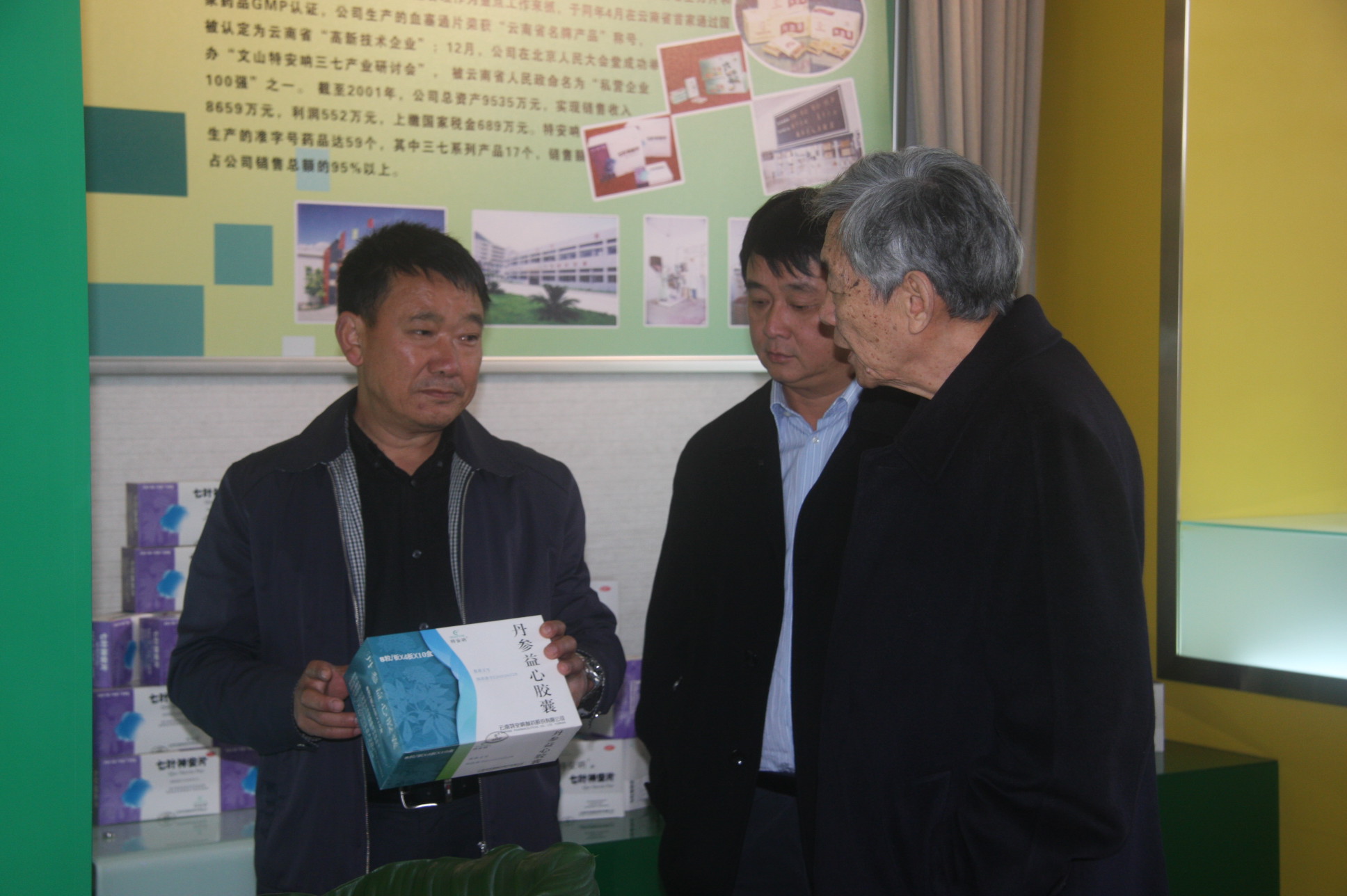 On December 6, 2014, Daphne received visit from a team headed by Mr. LANG Zhizheng, famous expert in quality and standardization, counsellor at the State Council, academician atInternationalAcademyfor Quality (IAQ) and professor at Beijing Institute of Technology School of Management and Economics. The guests, accompanied by Mr. LI Chengming, mayor of theWenshanMunicipality, and Mr. ZHU Shixin, executive vice mayor, were welcomed by VP LI Mingkun and Quality Manager HE Yuankai at the exhibition hall. After the guide's presentation on Daphne's history and products, Mr. LANG encouraged Daphne to step up R&D, introduce more sellable products and further build the Panax notoginseng industry. At the subsequent talk, Mr. ZHU Shixin briefed the attendees on construction and lease of the Wenshan Sanqi Industrial Zone. The government hopes to draw major enterprises and brands, with the aim at making Wenshan China's Panax notoginseng processing base and local growth driver. Mr. LANG offered nine ideas on construction of the Wenshan Sanqi Industrial Zone.