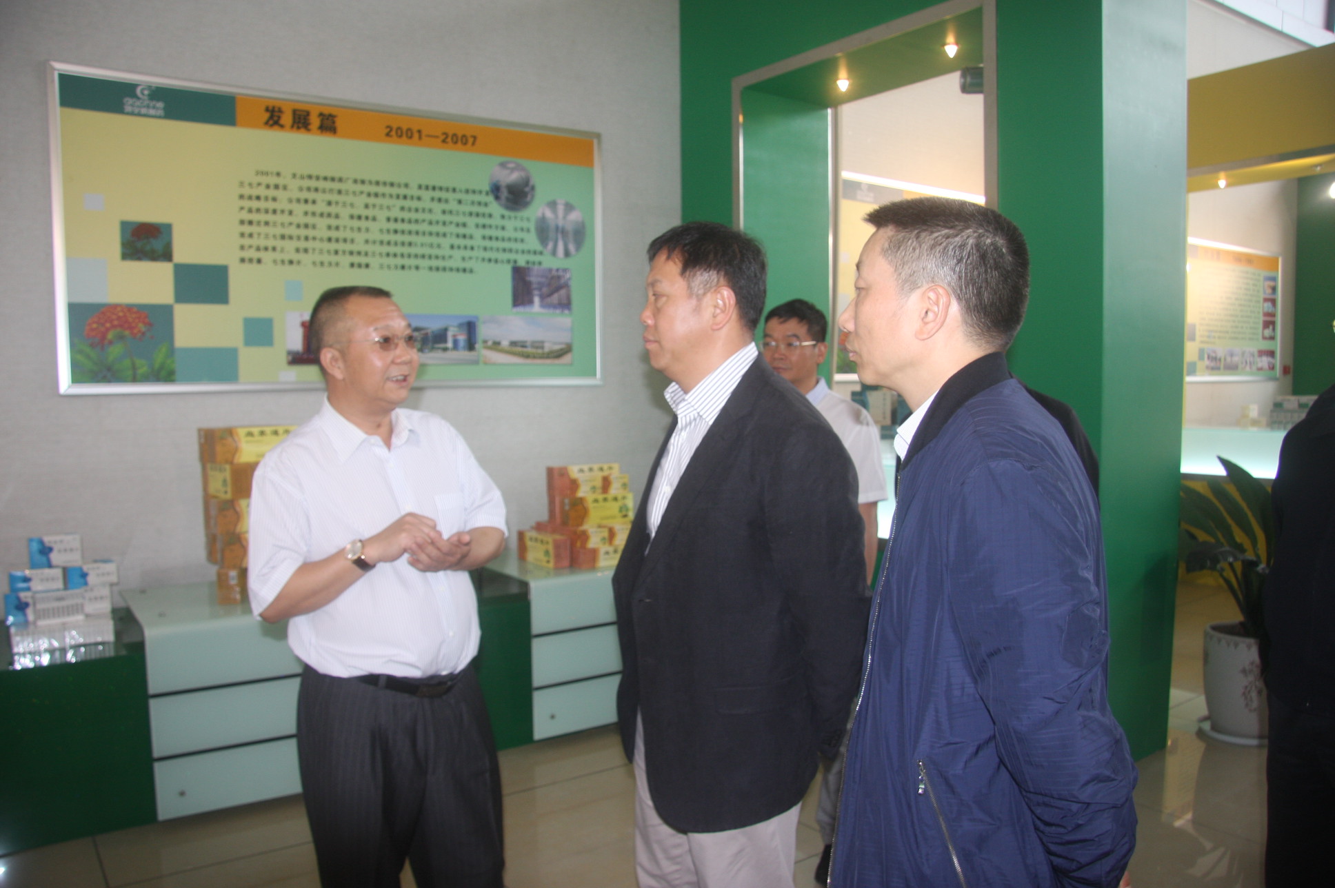 On April 23, 2015, guests from China Development Bank (CDB) Yunnan Branch headed by their President HONG Zhenghua toured Daphne under accompaniment of mayor of the Wenshan Municipality LI Chengming. They were warmly received by Chairman TANG Xiuwen at the exhibition hall and briefed on Daphne's history and products. Since 2012, to ensure secure supply of Panax notoginseng material, Daphne has channeled heavy fund to build Panax notoginseng material bases, so called First Workshops, thus extending the industry chain business. So far, Daphne solely owns 7 Panax notoginseng GAP bases, including 5 completed ones. 3 of the bases (3500 mu or =3500/15 233.33 ha.) are for commercial application, and the other 2 bases (600 mu or =600/15 40 ha.) for nursery. By 2017, more than 10,000 mu ( =10000/15 666.67 ha.) of permanent farming bases will be at work. Mr. HONG expressed the desire for closer cooperation with the enterprise to benefit both parties and local Panax notoginseng industry.