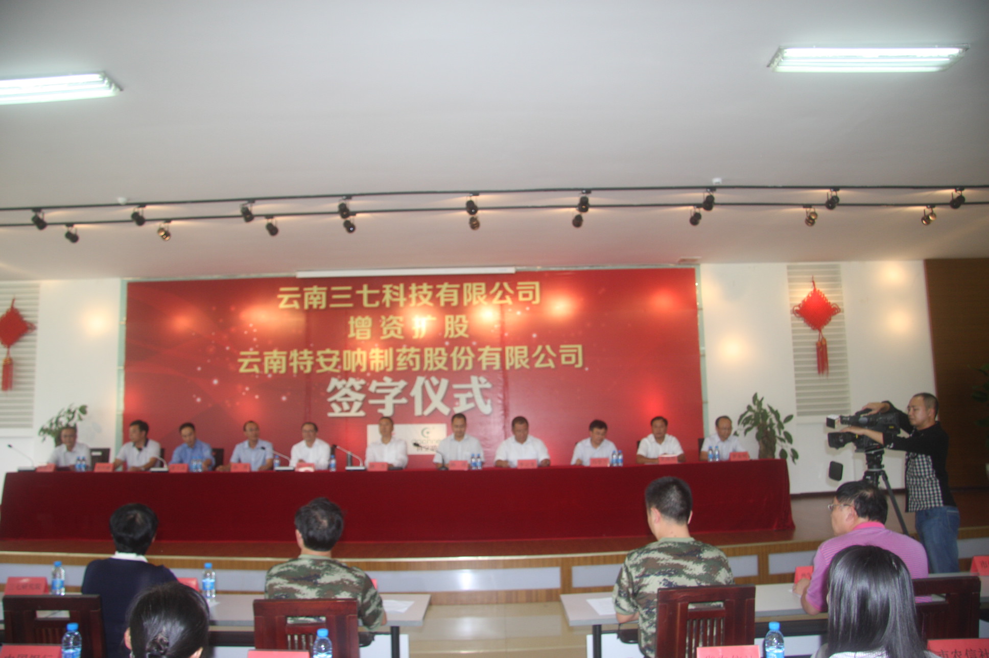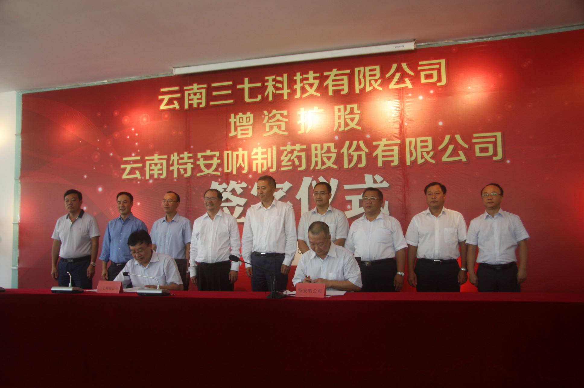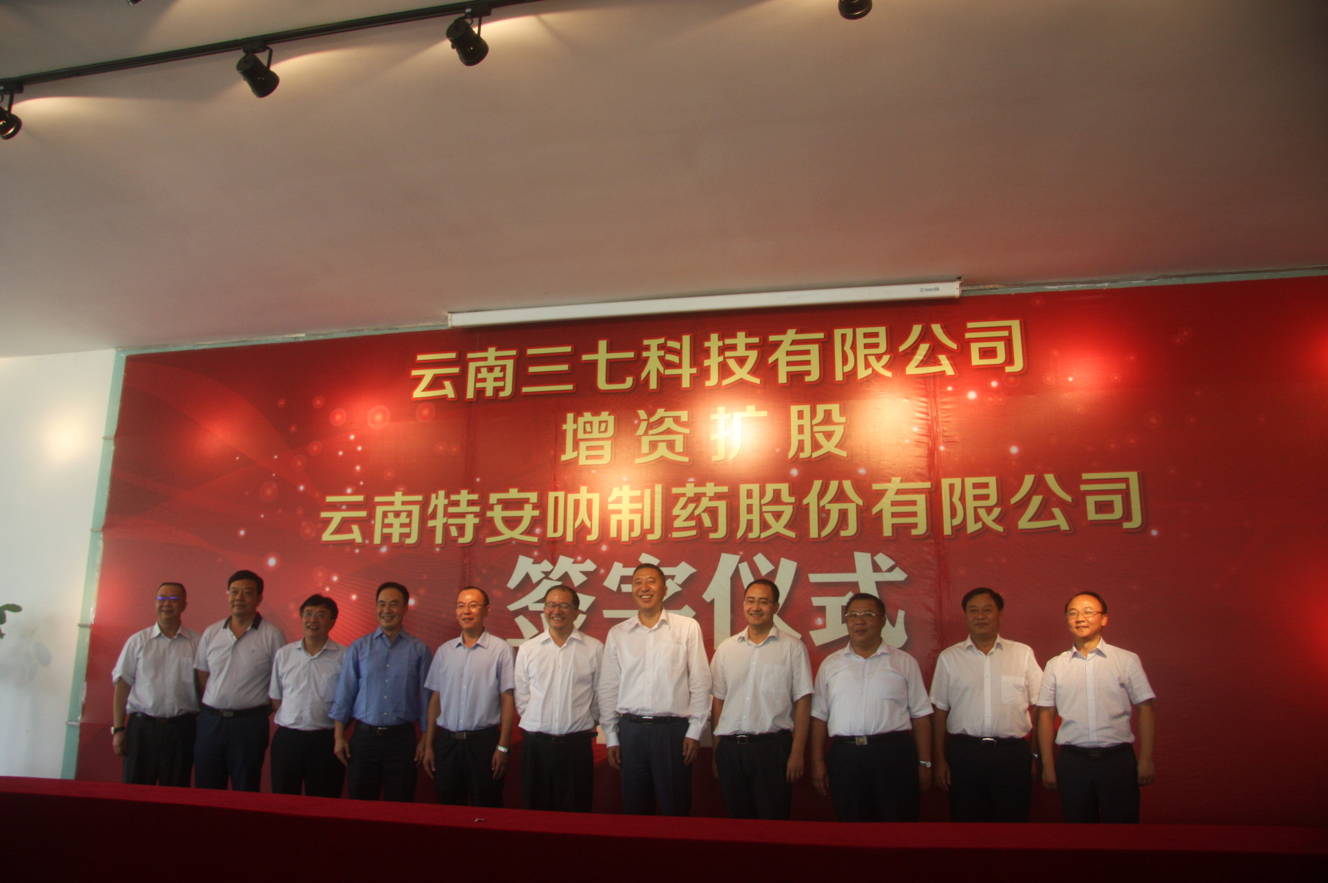 2015年731日下午,云南三七科技有限公司增资扩股云南特安呐制药股份有限公司签字仪式在文山举行。中共文山州委书记纳  杰,云南城投集团董事长许  雷、党委书记杨  涛,州委常委、文山市委书记李云龙等出席。州委常委、常务副州长孙  勇致词。