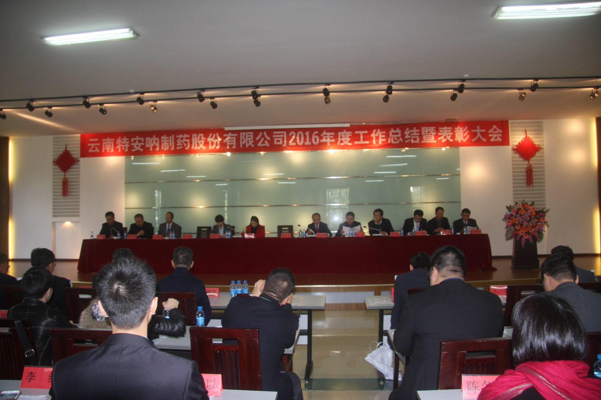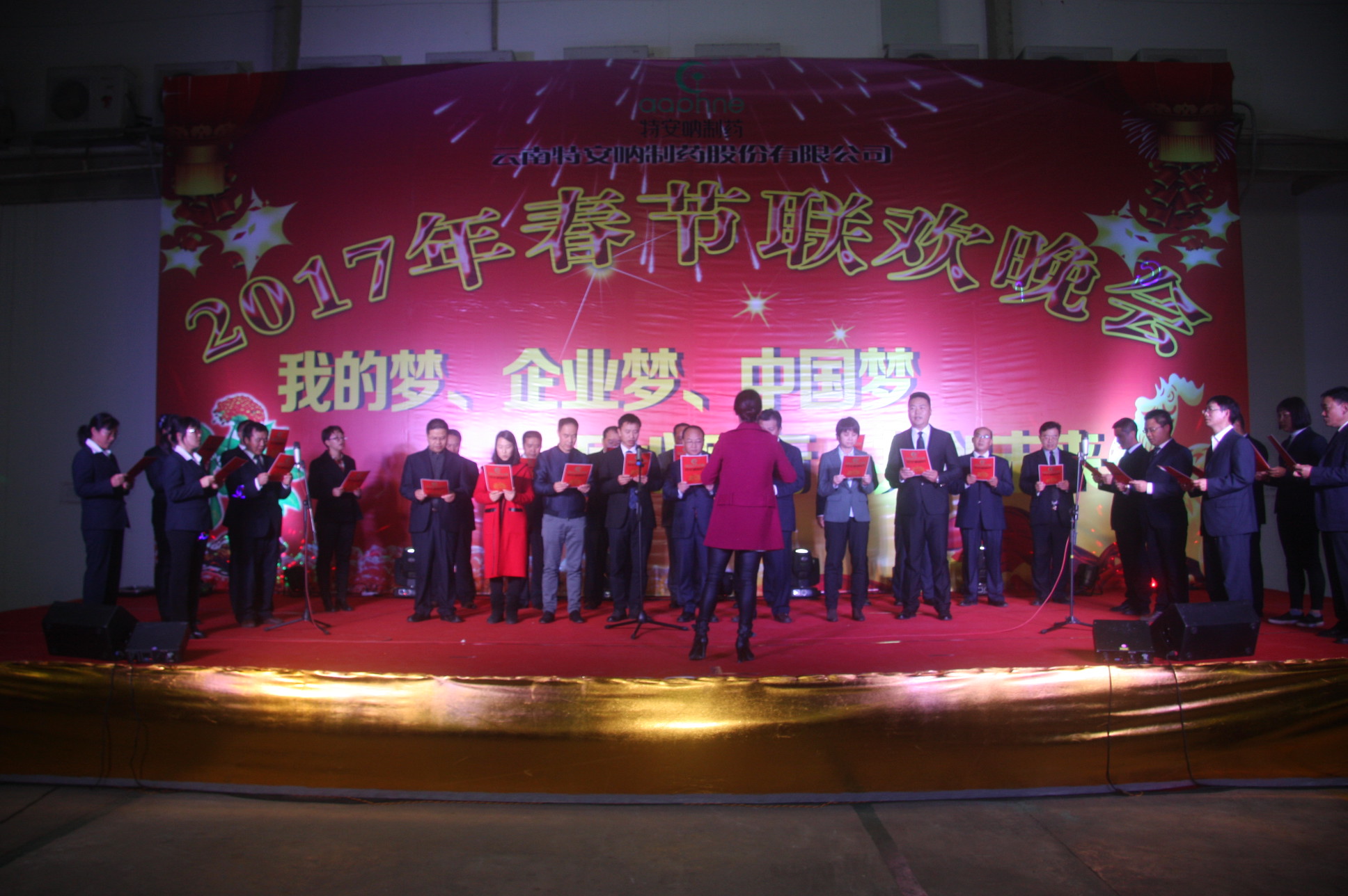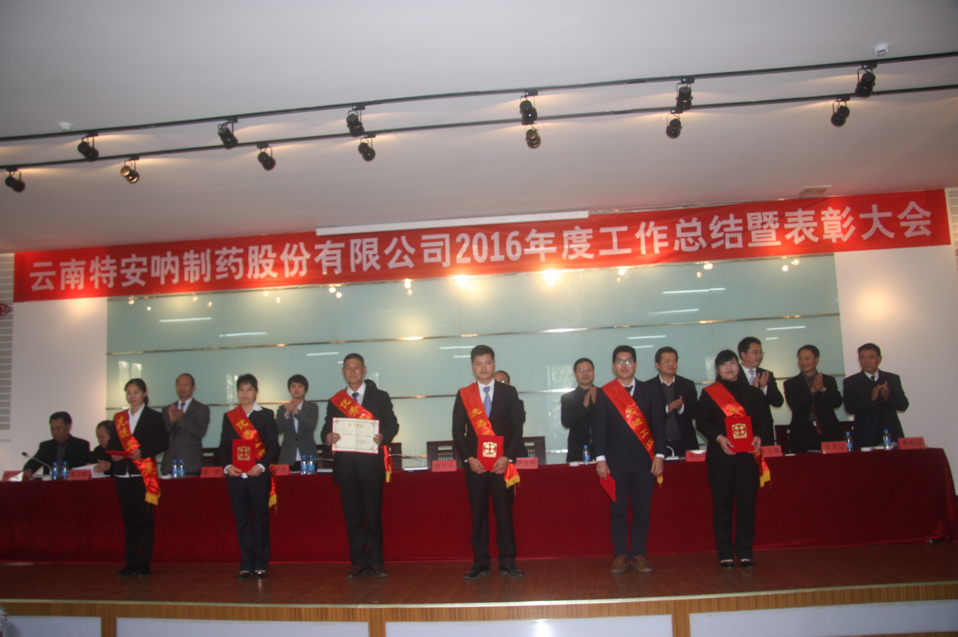 2017年1月17日,特安呐公司召开2016年度年终会暨表彰大会。大会在雄壮、豪迈的《特安呐之歌》歌声中开始,全体参会人员高唱《特安呐之歌》,昂扬奋进的旋律、大气磅礴的歌词让人斗志昂扬、催人奋进。2016年可以说是特安呐公司发展路程的“低潮年”,但全体特安呐人在云南城投集团和云南三七科技公司的领导下,在公司管理团队和全体员工的共同努力下,积极应对、探索出路、寻求在困难中求生存,在逆境中求发展,基本完成了各项任务。罗金明总经理在工作报告中对2017年的工作作出了安排部署,要求全体特安呐人继续发扬“自力更生,积极奋发、锐意进取,坚韧不拔”的精神,把特安呐做强做大。同时,在过去的一年中,也涌现出了一批优秀员工,他们迈着整齐的步伐走向领奖台,从领导手中接过属于他们的荣誉,这是对他们付出辛勤劳动的肯定,台下掌声雷动,向他们学习、向他们致敬!一年的欢聚就在这一天,18时,期盼已久的“我的梦、企业梦、中国梦——同心同行、共创未来”2017年春节联欢晚会拉开帷幕,公司中层以上领导干部齐声高唱《特安呐之歌》,为晚会拉开一个小高潮,员工自编自导自演的节目一个接着一个,一个比一个精彩,员工们在大饱口福的同时也大饱眼福,现场抽奖、微信红包穿插其中,让员工们热情高涨,领导为员工群发去一个个充满温馨的红包,大家只有一个字“抢”,抢到的眉开眼笑,抢不到的感叹手机运行速度太慢,大家其乐融融,欢声笑语回荡在大厅里,当主持人宣布明年再相聚的时候,大家还沉浸在回味中、欢乐中、幸福中,欢乐的时间总是很短,明天我们又将迎来新的征程,让我们高举三七产业发展的大旗,做一个红土地上奋力拼搏的好儿郎,同心同行、共创未来!