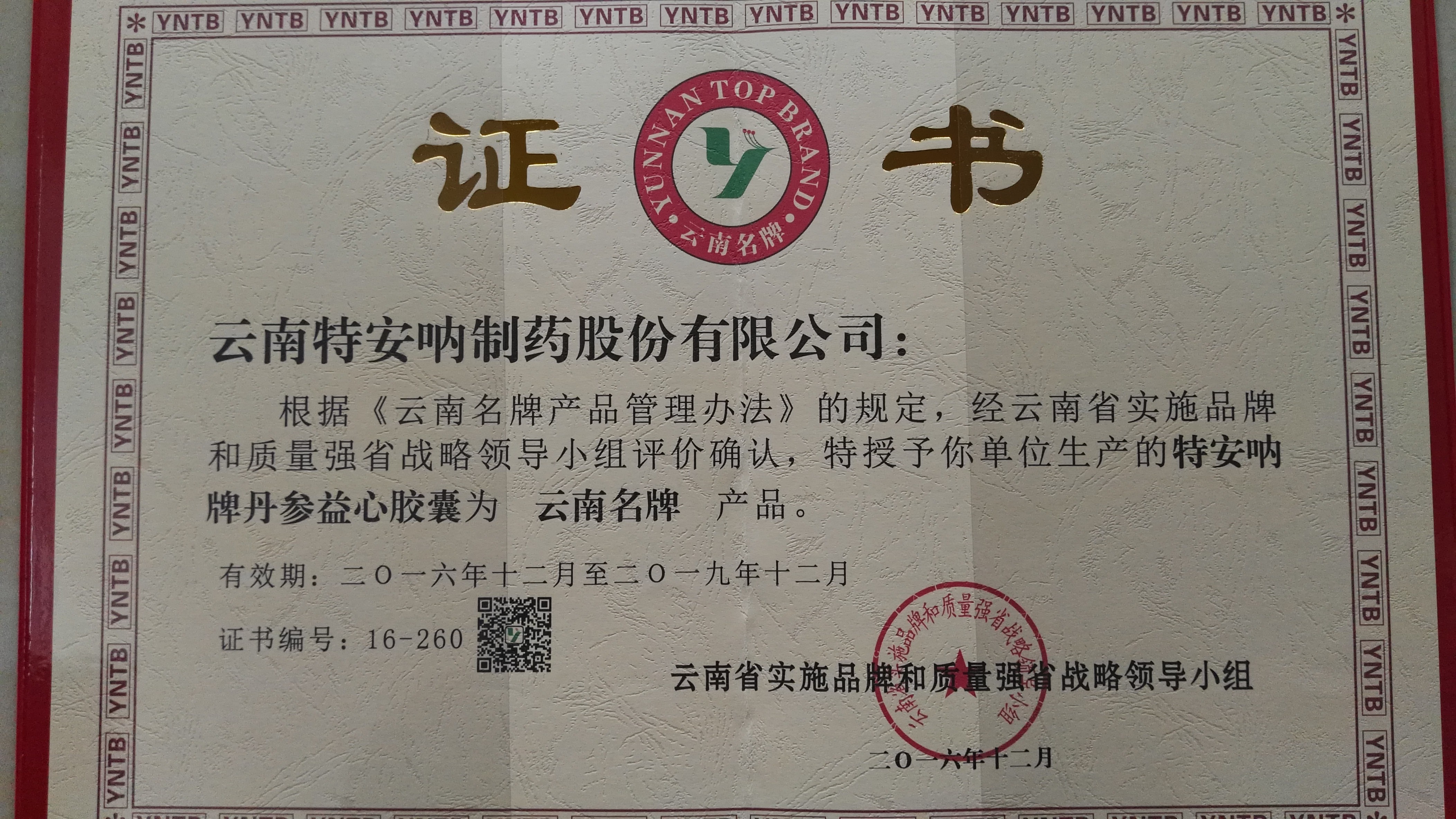 近日,捷报频传,公司又取得多项殊荣。获得国家工商行政管理总局2014-2015年度“守合同重信用”荣誉证书。特安呐牌血塞通片、丹参益心胶囊获得云南省实施品牌和质量强省战略领导小组颁发的“云南名牌”证书。公司自1994年成立以来就非常注重企业信誉,在生产经营过程中,诚实守信、追求产品质量,公司先后获得云南省、文山州、文山市“守合同重信用”荣誉证书,这次获得国家工商行政管理总局2014-2015年度“守合同重信用”荣誉可以说是对公司诚信的再次肯定。产品质量是企业的生命线,只有过硬的产品才能赢得消费者的信赖,公司建立了从产品第一车间(三七原料种植基地)到成品出库全过程的质量追溯体系,2014年1月,公司获得文山州人民政府颁发的首届文山州人民政府质量管理奖。血塞通片和丹参益心胶囊作为公司的主导产品,多年来以疗效准确、功效稳定而著称,成为治疗心脑血管疾病之良药,自2000年首次获得云南名牌产品称号以来,已多次获得此项殊荣。今后,公司将再接再厉、再创佳绩,把质量过硬、疗效准确的产品奉献给广大消费者。
