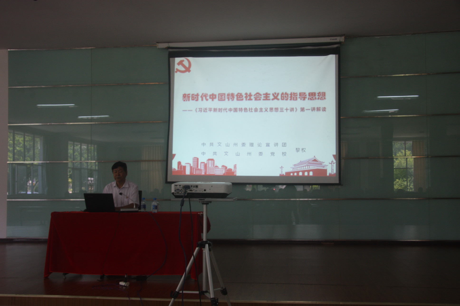 7月13日,州委党校黎权副校长以习近平新时代中国特色社会主义思想是党和国家必须长期坚持的指导思想为题,为广大员工和党员上了一堂生动有益的党课,讲课深入浅出、通俗易懂、事例翔实、感人肺腑、催人奋进,充分证明中国的改革开放离不开党的领导,习近平新时代中国特色社会主义思想,是马克思主义中国化最新成果,是党和人民实践经验和集体智慧的结晶,是中国精神的时代精华,是国家政治生活和社会生活的根本指针。