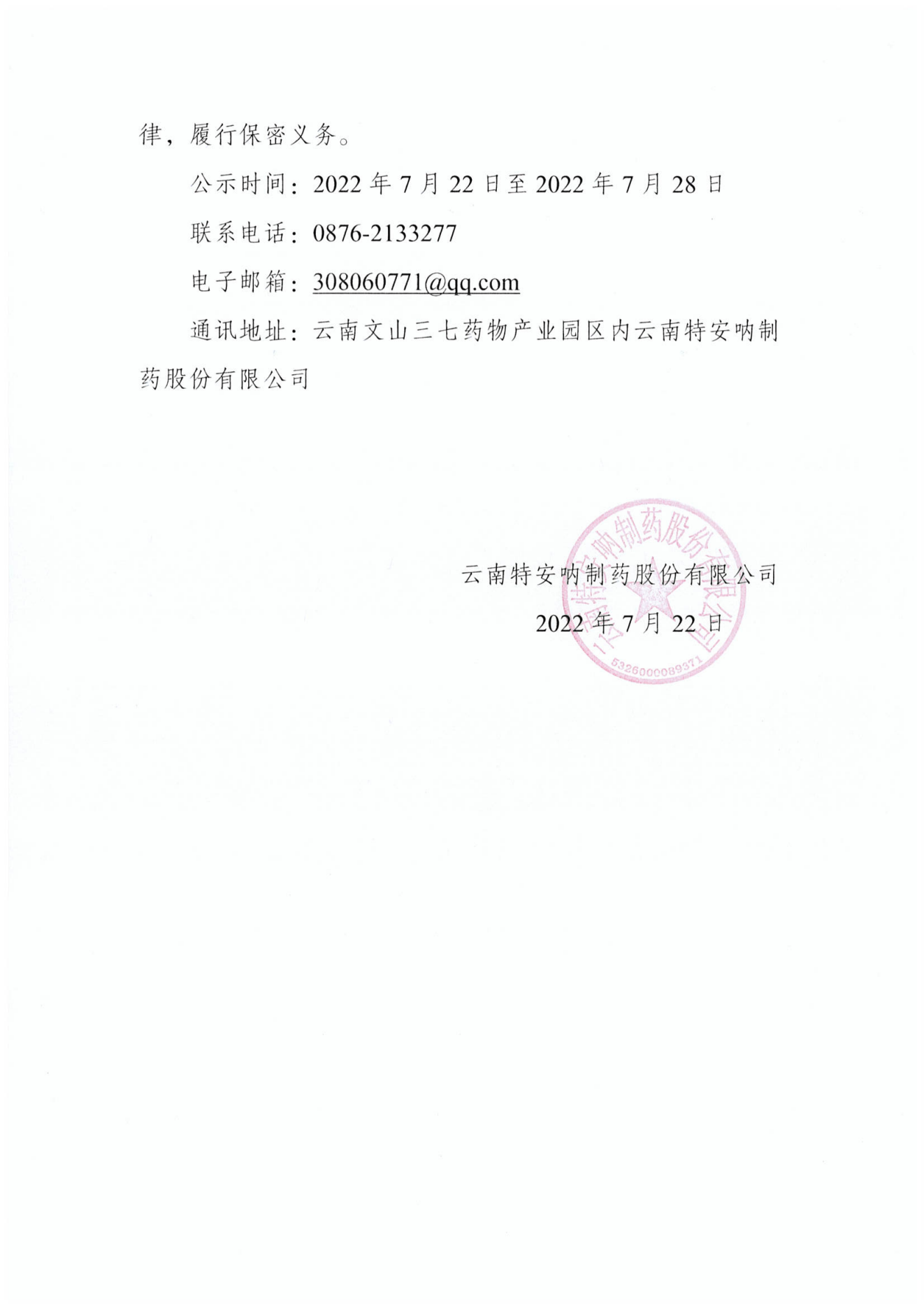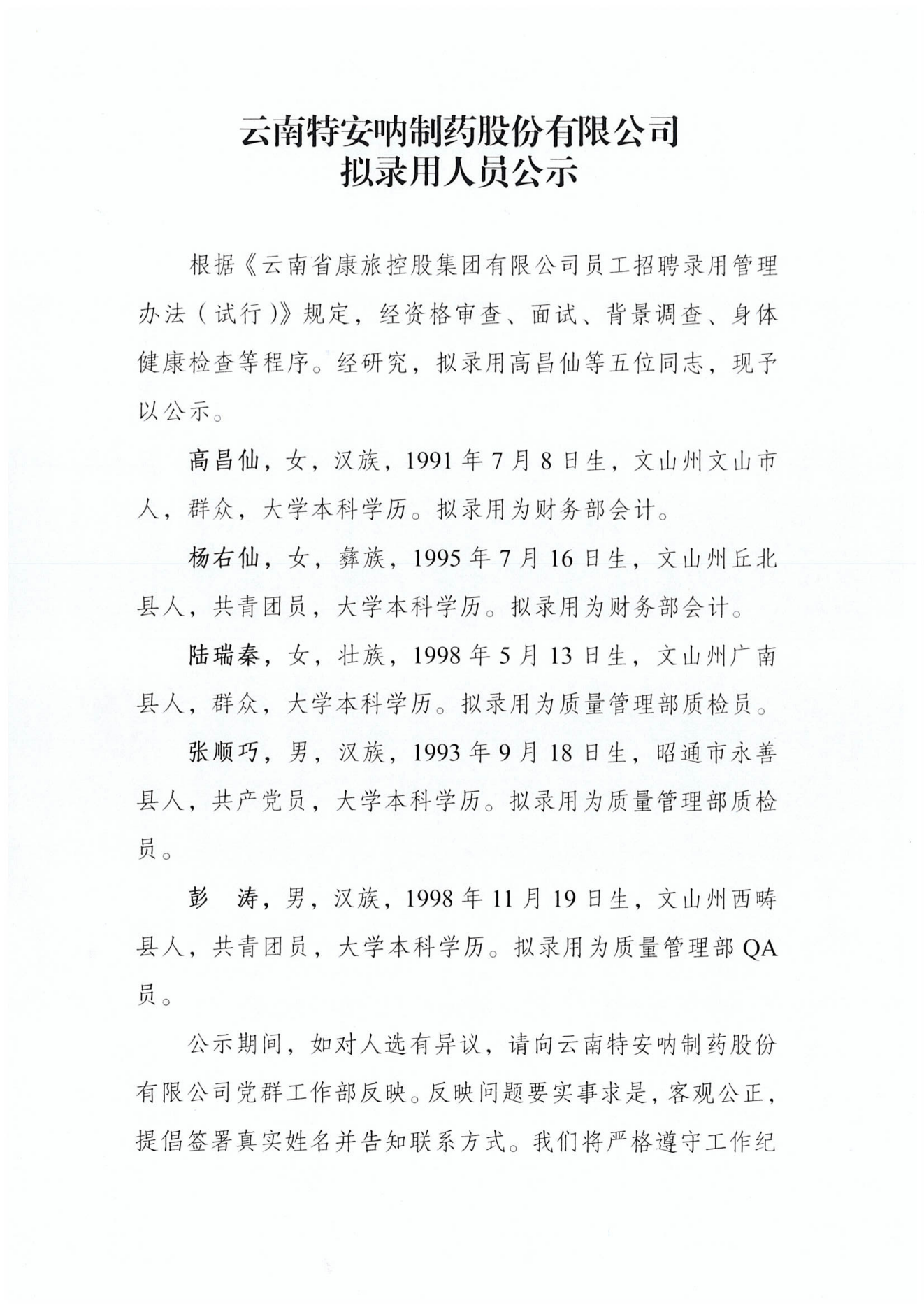 云南特安呐制药股份有限公司拟录用人员公示