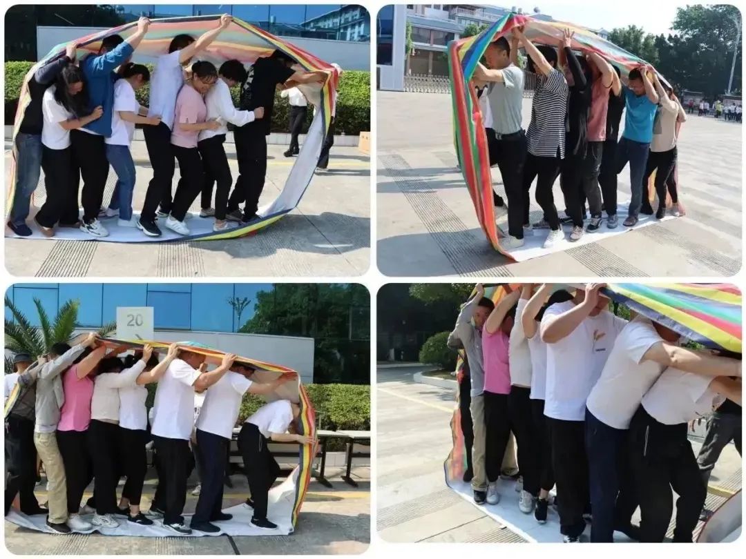 “毛毛虫竞技”,考验的是集体的智慧,是向心力、凝聚力。队员们同时骑在毛毛虫上,双脚撑地,紧密合作,齐心协力使毛毛虫的前进速度保持一致,做到又稳又快向前冲。