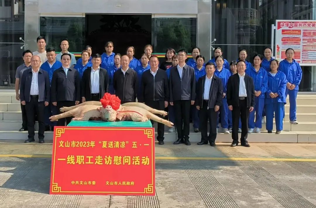 2023年4月30日下午,“五一”国际劳动节来临之际,文山市委副书记、市长乐加文,市人大常委会主任柏应明,副市长吕俊贤一行,率市人大、市政府办、市工信商务局、市统计局、市总工会领导到特安呐制药公司慰问“五一”期间坚守岗位的一线员工,并送上市委、市政府的关怀和慰问。