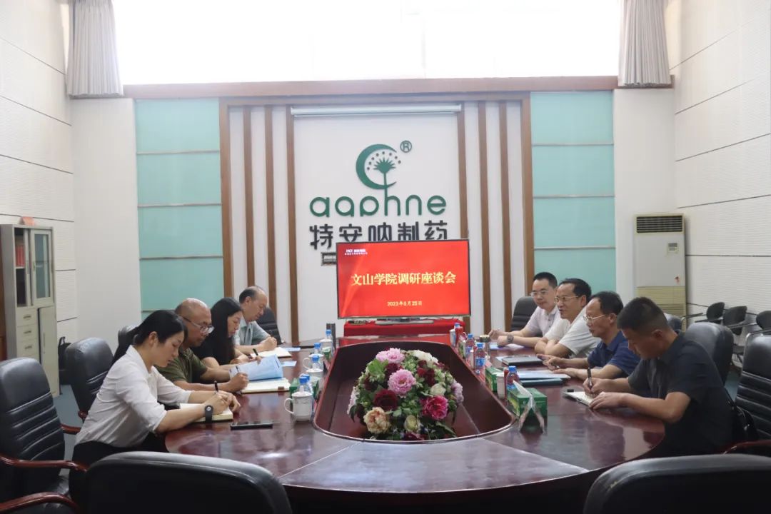 2023年5月25日,文山学院党委书记桂正华、副书记冯林虎一行到特安呐制药公司开展“访企拓岗”调研座谈。特安呐制药公司党支部书记、副董事长、常务副总经理邹慧宁,总经理刘加强,支委委员、董事长助理、副总经理王成标参加此次座谈。